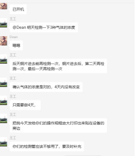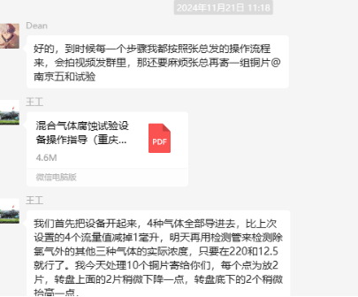 2024年8月份重慶******第三方檢測(cè)公司再次采購我司一臺(tái)型號(hào)為“WHQ-300B”型的混合氣體腐蝕試驗(yàn)箱,設(shè)備被運(yùn)送到客戶指定的場(chǎng)地安裝調(diào)試運(yùn)行。客戶后期自行進(jìn)行一次銅片增重試驗(yàn),起初試驗(yàn)結(jié)果不是很理想,,試驗(yàn)的流程和注意事項(xiàng)未了解透徹,我司針對(duì)以上信息,整理了操作指導(dǎo)作業(yè)書進(jìn)行幫助理解;通過理論知識(shí)和我司技術(shù)人員線上指導(dǎo)操作的配合,該增重試驗(yàn)很成功。試驗(yàn)結(jié)束之后客戶將數(shù)據(jù)發(fā)給我司,以下是客戶和我司聊天記錄以及客戶做的數(shù)據(jù)信息: